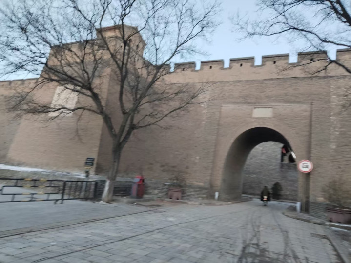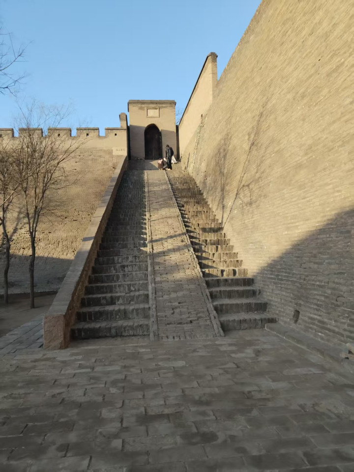 出了镖局,雪势稍歇,阳光从云缝里漏下来,洒在古城的城墙上。我们沿着青石板路往古城墙走,脚下的石板被积雪融水浸得发亮,坑洼处积着碎雪,像是时光咬出的齿痕。平遥古城墙始建于西周,明洪武年间重筑,六百年的风雨磨平了墙砖的棱角,却磨不掉它的巍峨。拾级而上时,台阶陡峭,砖石的缝隙里还嵌着枯黄的草茎。站在城墙上往远处望,整座古城铺展在眼前,四合院的屋脊连成一片波浪,飞檐翘角顶着积雪,像一群伏在雪地里的飞鸟。同行的伙伴指着远处的角楼说,当年这城墙是抵御外敌的屏障,如今却成了凝望历史的窗口。风从城垛间穿过,带着雪的凉意,恍惚间仿佛听见了古时的更鼓,一声一声,敲在平遥的晨暮里。