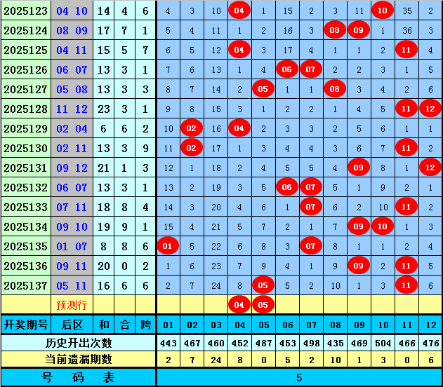 后区分析:上期后区开出奖号05和11,在最近50期开奖中,后区奖号012路落号比为27:35:38,前10期后区012路落号比为6:6:8,本期后区关注号码03、04、05、08、11,两码参考04、05。