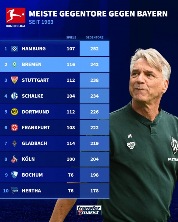 直播吧9月26日讯本周五晚拜仁即将在主场迎战不莱梅,德国转会市场网统计了德甲成立以来面对拜仁丢球数最多的10支球队,其中汉堡排名第一,不莱梅就位居第二。
